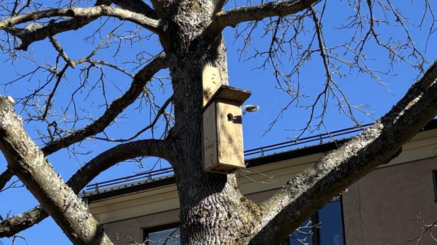 Fågelholkar och insektshotell 21 mars 2026 Vår trädgårdsmästare Solbruden hälsar våren med nya fågelholkar och insektshotell i träden på gården. Åtminstone en holk har redan fått sina första nybyggare, ett blåmespar. Jättekul!